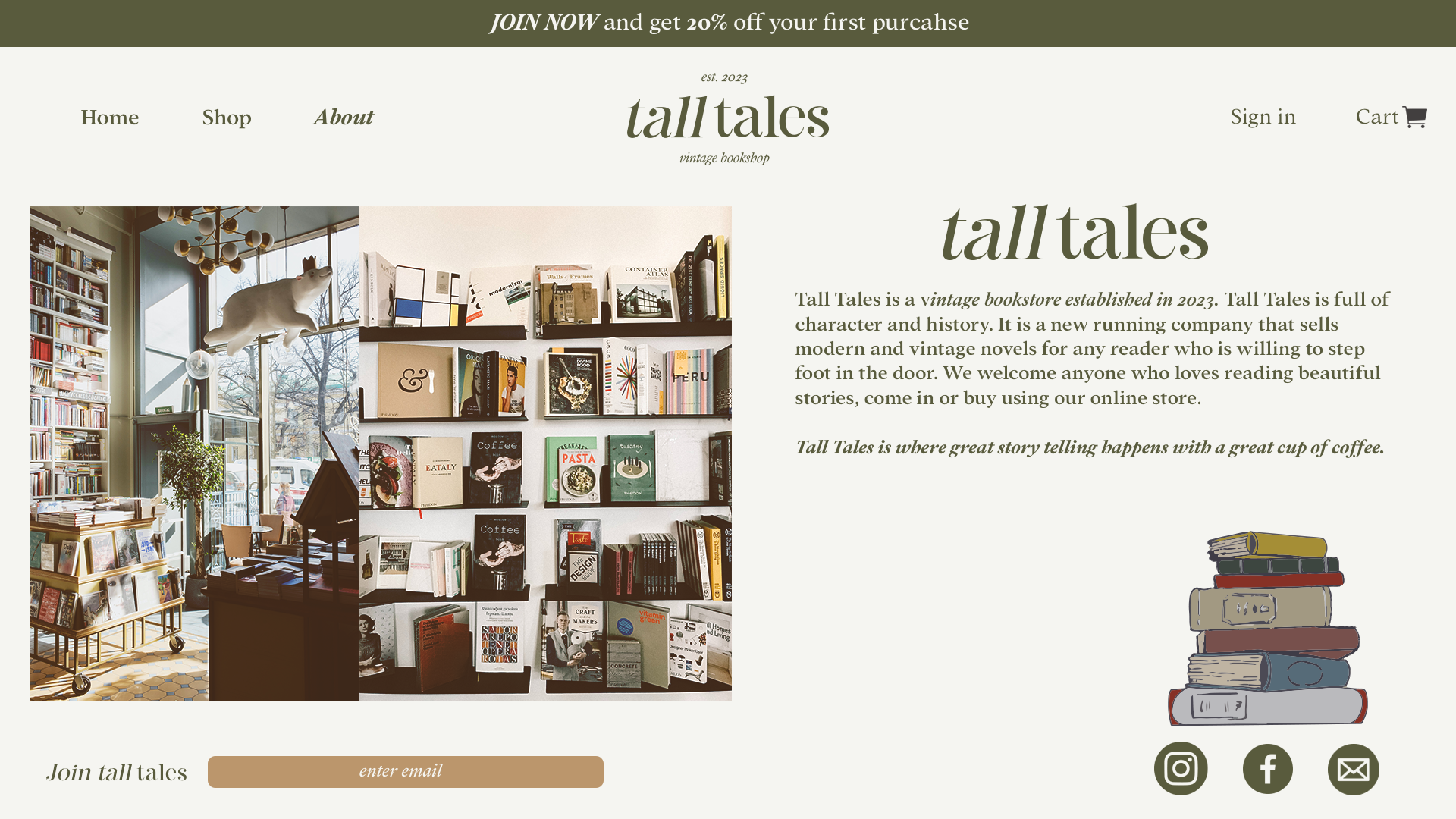 Tall Tales is a vintage bookstore established in 2023. Tall Tales is full of character and history. It is a new running company that sells modern and vintage novels for any reader who is willing to step foot in the door. We welcome anyone who loves reading beautiful stories, come in or buy using our online store. Tall Tales is where great story telling happens with a great cup of coffee.