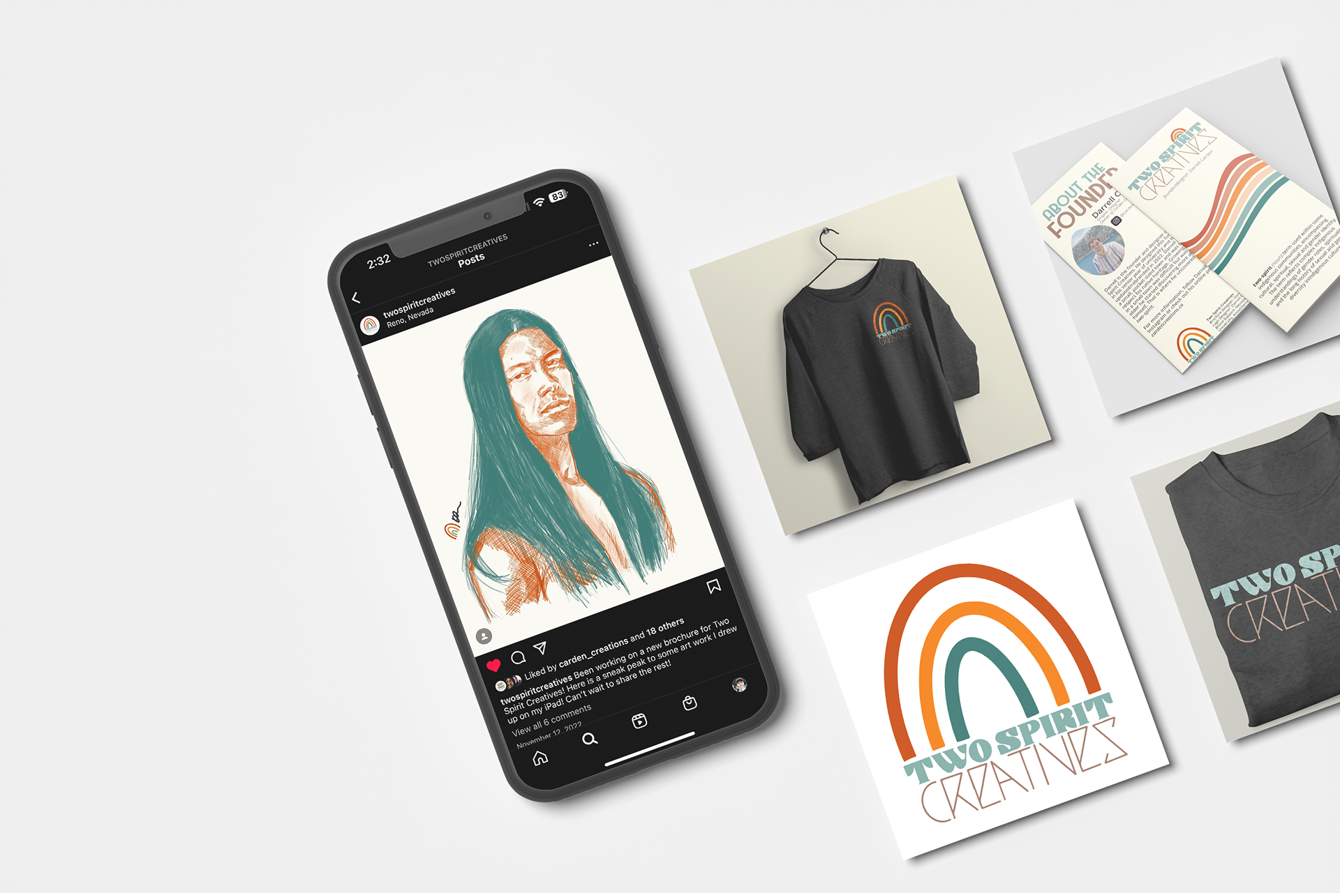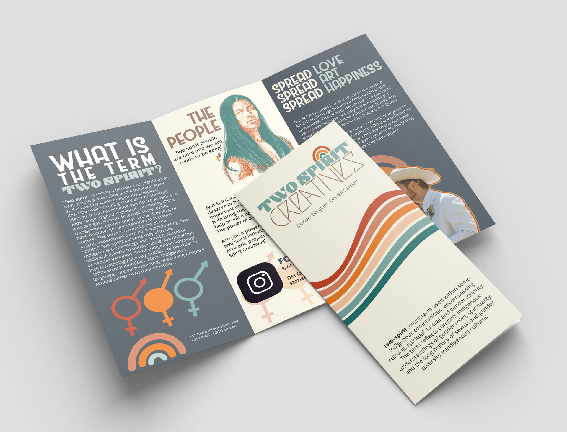 Resolution: My project is based on the term two-spirit. “Two-spirit” refers to a person who identifies as having both a masculine and a feminine spirit, and is used by some Indigenous people to describe their sexual, gender and/or spiritual identity.” (Fewster 2022). It can cover same-sex desire as well as a wide range of gender diversity, including those who are gay, lesbian, bisexual, transsexual, transgender, gender queer, cross-dressers, or have multiple gender identities in Western culture. Two Spirit Creatives is my awareness brand I founded and I created the logo, merchandise, social media presence, and community awareness. The company's mission statement is as follows: